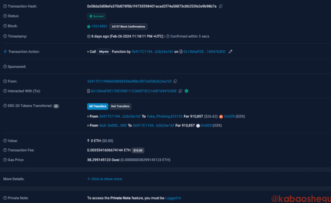 研究该迁移机制后发现,当用户调用"迁移"功能时,他们的V1 OZK代币将转移到部署者钱包(后来标记为Fake_Phishing323133),之后会获得V2 OZK代币。案例见下图: