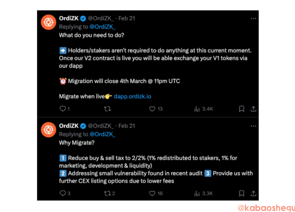 2月21日,OrdiZK通过其X账户声称,他们将把合约迁移至V2,新合约将于2月26日创建,用户可以在3月4日之前进行迁移。
