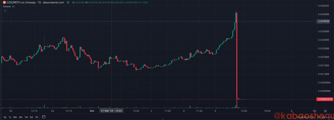 迁移截止后的3月5日,OrdiZK部署者以35.65 ETH(约13.4万美元)的价格从旧合约中出售了4.89亿个OZK,导致了高达98%的价格滑点。