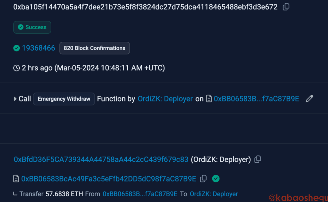 随后,部署者两次调用了EmergencyWithdraw函数,从OZK质押合约中分别提取了57.68 ETH和0.90 ETH。