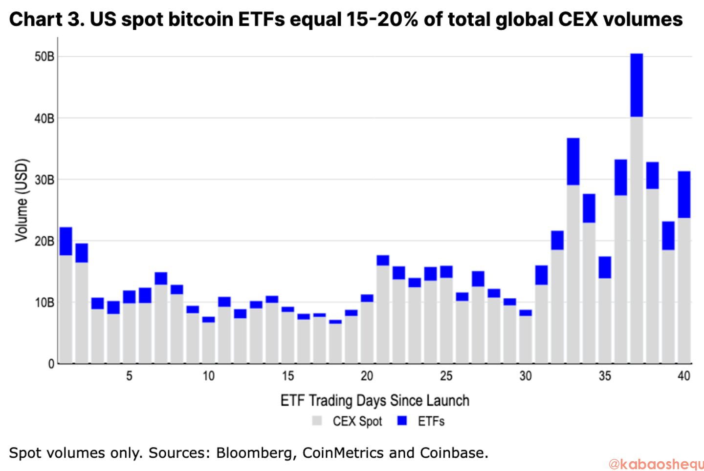 如今,ETF 的流入有望以渐进、持续的方式吸收大部分供应。事实上,ETF 现在的日均 BTC 现货交易量约为 40-50 亿美金,占全球中心化交易所总交易量的 15-20%,这使得流动性足以让机构在该领域进行交易。从长远来看,这种稳定的需求状况可能会对比特币的价格产生积极的影响,因为它创造了一个更加平衡的市场,集中抛售的波动性较小。