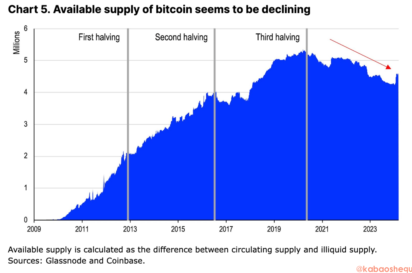 乍一看,比特币交易可用性的下降似乎是比特币表现的主要技术性支撑之一,因为我们有来自 ETF 的新机构需求。但事实上,考虑到进入流通的新比特币即将减少,这些供需动态表明,短期内市场紧缩的可能性可能很高。也就是说,我们认为这个框架并不能完全捕捉到比特币市场流动性动态的复杂性,特别是因为「非流动性供应」并不意味着静态供应。