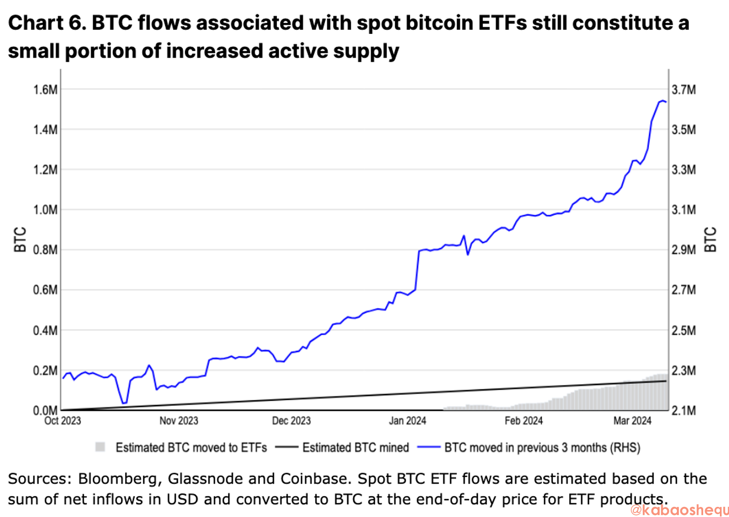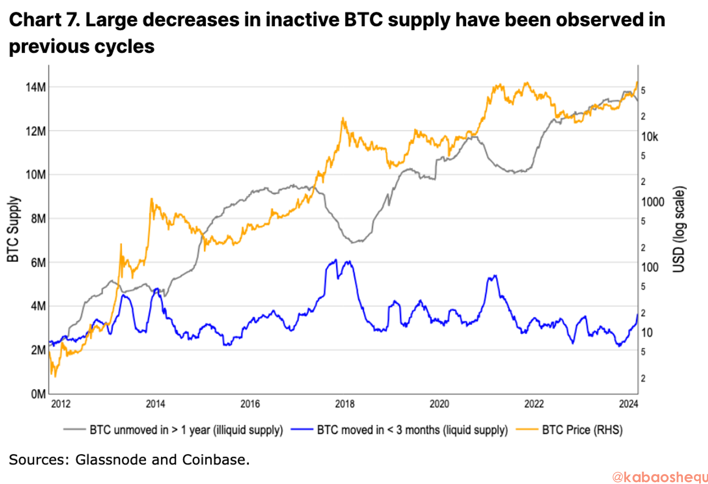 事实上,虽然新比特币供应限制是一个重要的考量因素,但它也只是诸多因素中的一种。自 2020 年初以来,可供交易的比特币(即流通和非流动性供应之间的差值)一直在下降,这与之前的周期相比发生了重大变化。但最近的数据表明,自 23 年第四季度初以来,活跃的 BTC 供应量(在过去 3 个月内发生过转移的比特币)大幅增加了 130 万,而在此期间新开采出来的比特币仅为约 15 万。尽管市场比过去更有能力吸收这种供应,但我们仍然认为,谨慎的做法是不要过度简化这些市场动态之间的,复杂的相互作用。