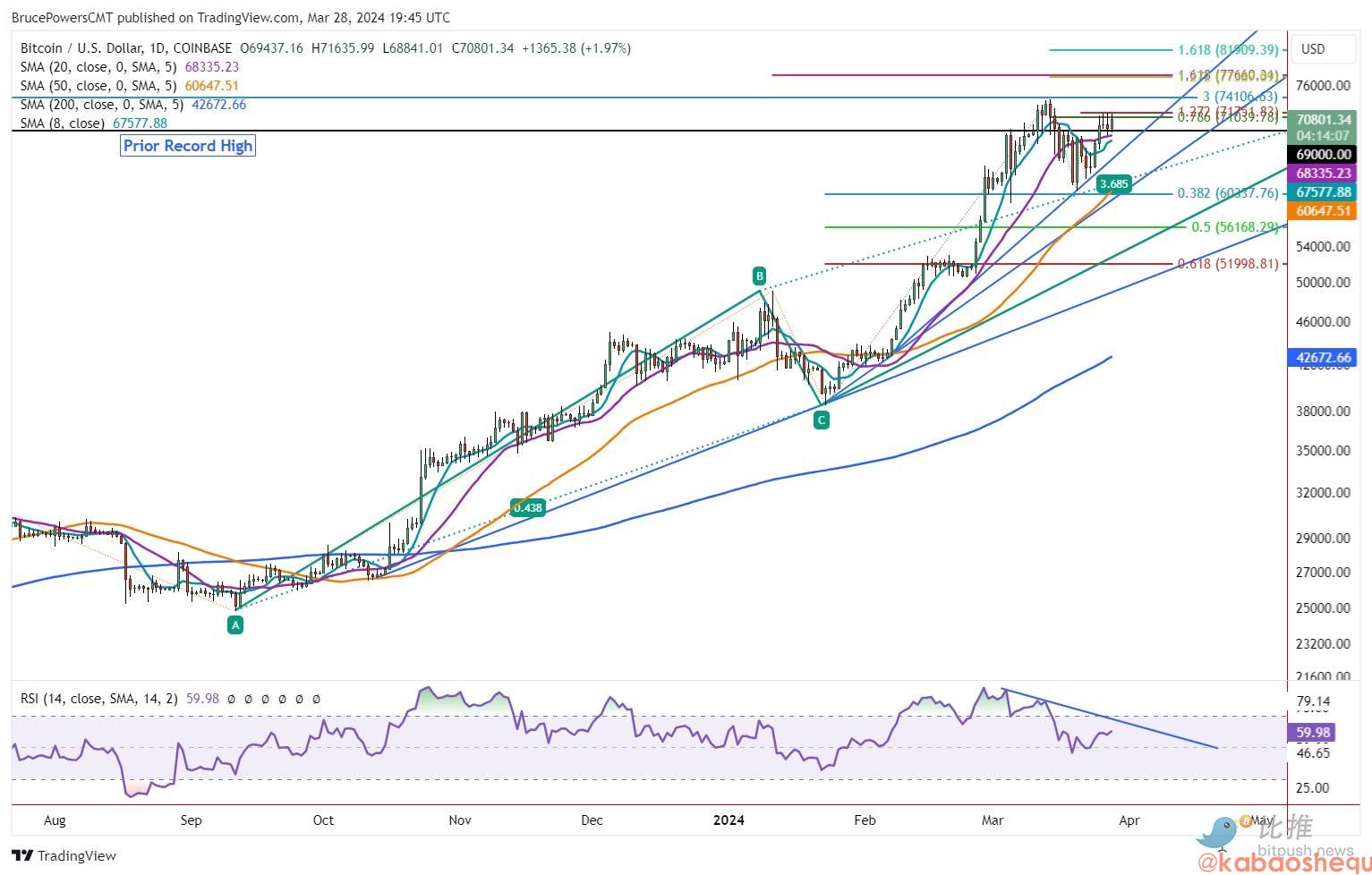 加密分析师 Bruce Powers 认为,过去四天,比特币一直在 78.6% 斐波那契回撤位的阻力位附近受到冲击,面临 71,790 点阻力,过去几天交易一直保持在 20 日均线上方。上升趋势保持不变,但 RSI 的看跌背离表明回调可能还会进一步进行。突破本周高点 71,290 点的决定性反弹将引发上涨趋势的看涨延续,初步新高目标位于 77,660 点左右,该目标位由两个斐波那契水平确定。