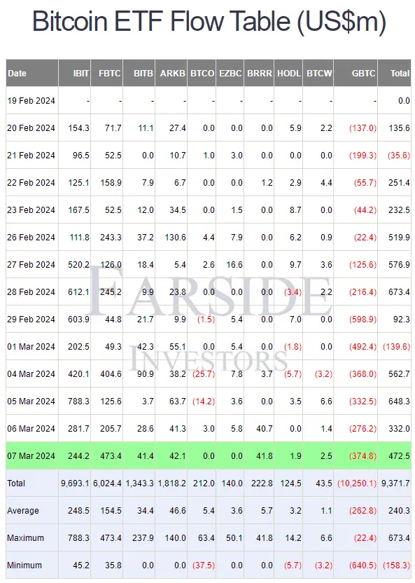 Farside Investors数据显示,截止3月8日15时,自比特币现货ETF通过以来,累计净流入为93.7亿美元。