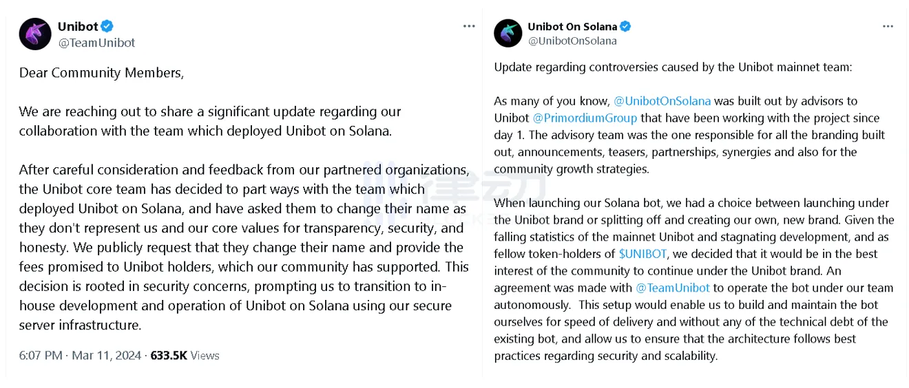 然而,Unibot 核心团队却宣布与 Unibot on Solana 团队解除合作,并要求对方更名,同时宣布由内部开发和运营 Solana 上的 Unibot。随后,Unibot on Solana 团队也发文宣布重塑品牌并与 Unibot 主网团队完全分离。