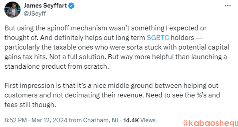 彭博 ETF 分析师 James Seyffar 更是直言不讳地表示,灰度提交的迷你信托申请就是为了帮助长期持有者避税,而且几乎可以肯定的说,迷你信托会让长期 GBTC 持有者收益,尤其是那些受到潜在资本利得税打击的持有者,他们此前必须缴纳税费,这是帮助客户在不减少收入和抛售之间找到了的一个很好的中间立场。