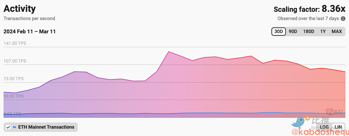 根据 L2Beat 数据,过去 7 天 L2 网络的平均每秒交易量 (TPS) 为 93.18,而以太坊的平均每秒交易量 (TPS) 为 14.42,L2 Scaling Factor 倍数约为 8.36。